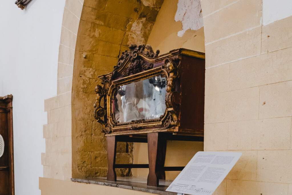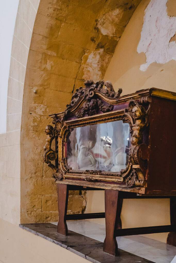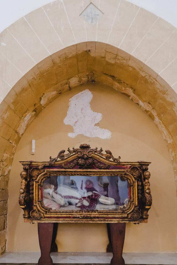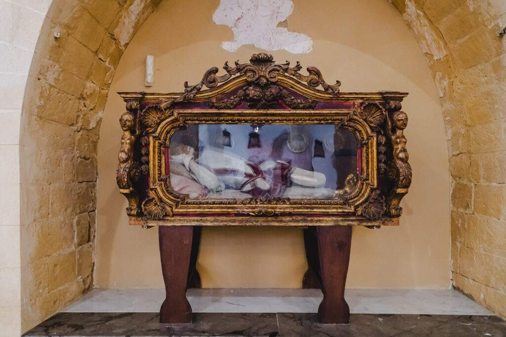 Nell’urna di vetro si trova un corpo imbalsamato. Ufficialmente è San Felice Martire. Con questo nome, però, vi sono 15 martiri riconosciuti dalla Chiesa e non è dato sapere quale sia di essi.